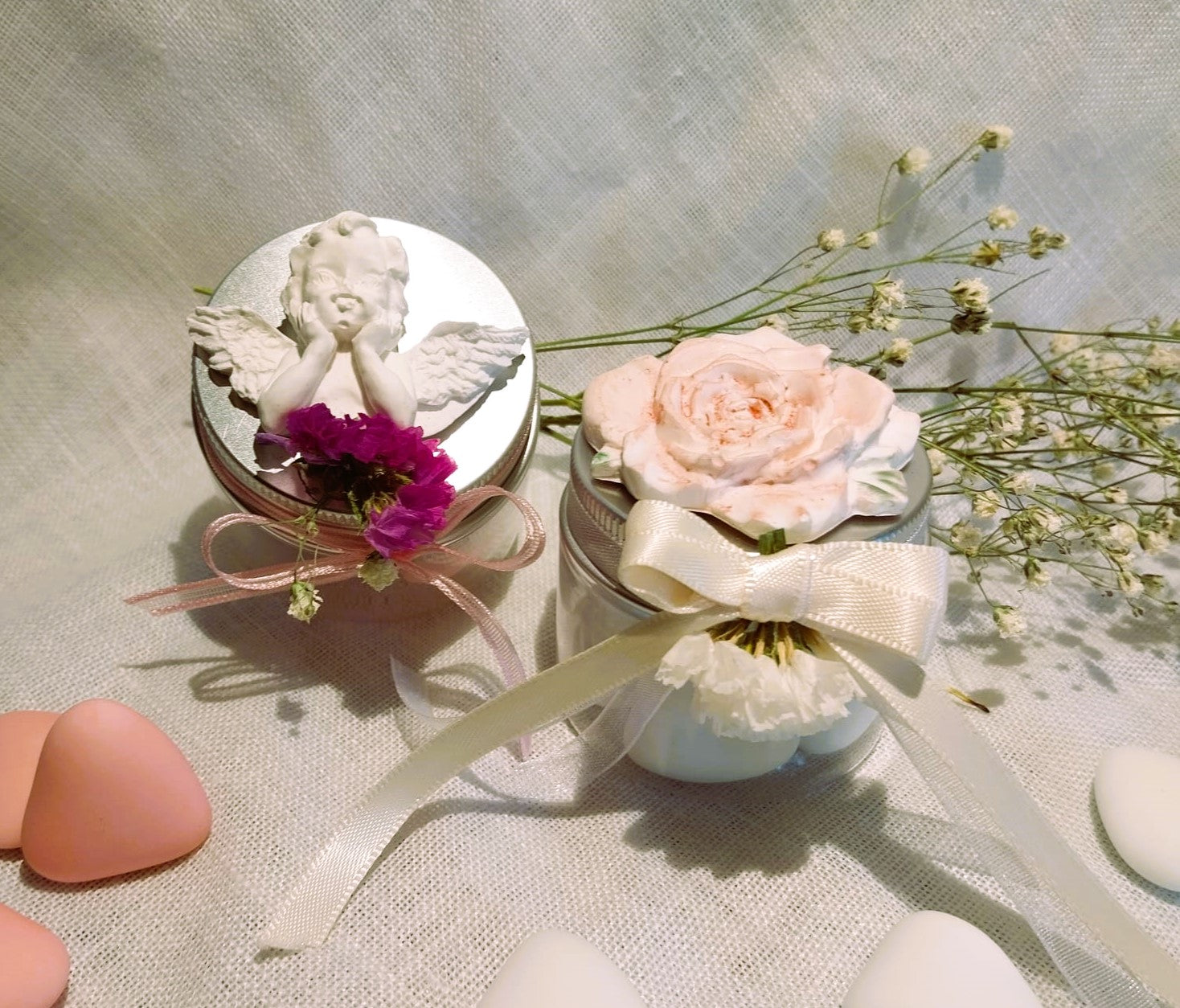 Portaconfetti in plastica, con decorazione in gesso realizzata a mano e fiori veri.